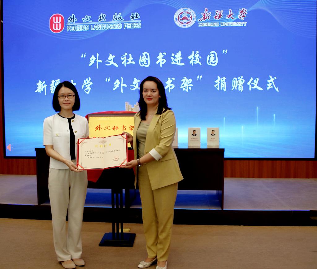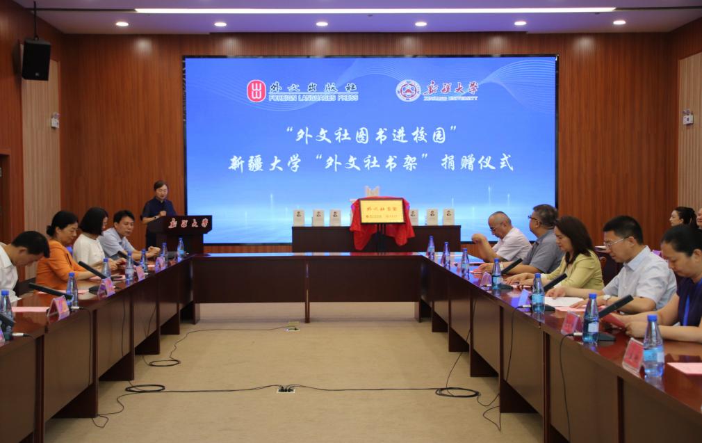 8月13日,新疆大学图书馆内书香盈溢,“外文社图书进校园”暨“外文社书架”捐赠仪式在此隆重举行。