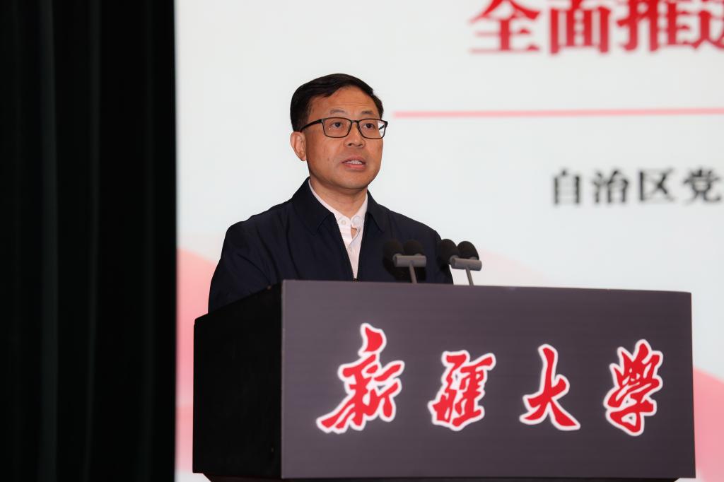为学习贯彻自治区党委十届十五次全会精神,全面推进反恐维稳法治化常态化,近日,新疆大学特邀自治区党委政法委常务副书记、新疆法学会党组书记毕德国开展专题宣讲。校党委书记代斌主持并讲话。